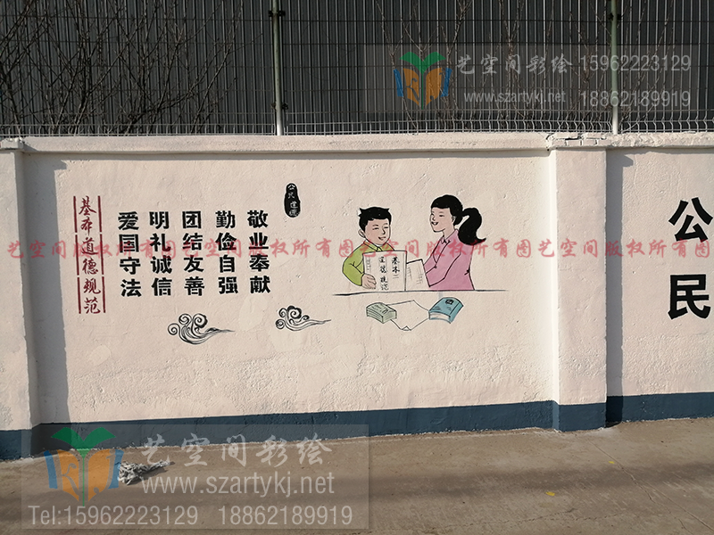 通过墙绘的形式,从富强、民主、文明、和谐,自由、平等、公正、法治,爱国、敬业、诚信、友善等方面,着力开发宣传阵地、丰富宣传形式,大力开展核心价值观宣传,深入培育和践行社会主义核心价值观,引导市民群众共建唯美乡村。